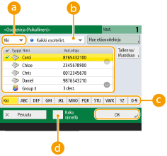 -painikkeilla ja valitsemalla sitten <Tiedot>. Voit poistaa vastaanottajan määritetyistä vastaanottajista valitsemalla <Poista v.o.>.|