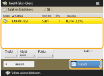 Tällä toiminnolla tallennetaan määritettyyn tallennuspaikkaan (Salainen faksilokero) vastaanotetut asiakirjat, jotka täyttävät tietyt ehdot. Salainen faksilokero sisältää useita lokeroita, joista jokainen voidaan suojata salasanalla. Määrittämällä ehdon, kuten kaikkien Yhtiö A:n asiakirjojen tallentamisen lokeroon Nro 10, voit tarkistaa vain tarvitsemasi asiakirjat. Tällä toiminnolla voit myös estää valtuuttamattomien henkilöiden pääsyn salaisiin asiakirjoihin tahattomasti asettamalla salasanan. Kun käyttöpaneelin Käsittely/Data -ilmaisin palaa tasaisesti vihreänä, tarkista tai tulosta tallennetut asiakirjat seuraavien ohjeiden mukaisesti.