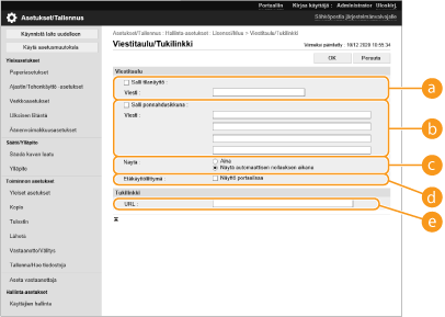 Voit näyttää viestejä käyttäjille kosketusnäytössä. Viestejä voidaan näyttää kosketusnäytön alaosassa tai erillisessä ponnahdusikkunassa, ja voi valita käytettävän näyttötavan viestin tyypin tai käyttäjän mukaan. Kun viesti näytetään ponnahdusikkunassa, voit näyttää saman viestin myös Remote UI (Etäkäyttöliittymä) -sovelluksen portaalisivulla. Pääkäyttäjän valtuudet vaaditaan näiden asetusten koostamiseen.
