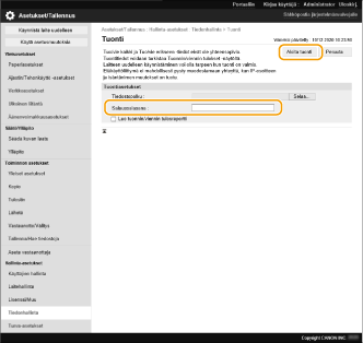 Voit viedä kaiken asetusdatan laitteesta ja tallentaa sen tietokoneeseen, ja seuraavaksi tuoda sen kun koostat uuden laitteen asetuksia, kuten jos olet hankkinut korvaavan laitteen. Jos haluat määrittää samat asetukset kahteen tai useampaan Canon-monitoimitulostimeen*, voit yksinkertaisesti viedä kaikki asetukset yhdestä laitteesta ja tuoda ne kaikkiin muihin, jolloin laitteita ei tarvitse määrittää erikseen. Kun suoritat näitä toimenpiteitä, kirjaudu Remote UI (Etäkäyttöliittymä) -sovellukseen Pääkäyttäjän valtuuksilla.