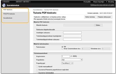 Käyttämällä Remote UI (Etäkäyttöliittymä) -sovellusta on mahdollista tulostaa tiedostoja jotka on tallennettu tietokoneeseen tai verkkoon suoraan laitteesta käyttämättä tulostinajuria. Sinun ei tarvitse avata tietokoneessa olevia tiedostoja tulostusta varten.