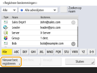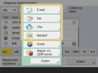 U kunt het faxnummer of e-mailadres van een ontvanger dat kan worden gebruikt voor het verzenden van gescande documenten, in het adresboek opslaan. U kunt ook een I-faxbestemming, een maplocatie van een bestandsserver (IP-adres en pad) en de opslag (Geavanceerde ruimte) van een multifunctionele Canon-printer als bestemming opslaan in het adresboek.
