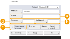 ) en het wachtwoord ( ) gebruiken u voor het adresboek te registreren. Voor meer informatie raadpleegt u <Info. vr verificatie verzenden/doorbladeren bestand>.Als u <Protocol> instelt op <Windows (SMB)> of <FTP>, waarbij u een map selecteert die niet bestaat in <Mappad> dan zal dat tot gevolg hebben dat de map automatisch wordt aangemaakt en de bestanden hierin worden opgeslagen. Een verzendfout zal echter optreden als u een specifieke map specificeert met meerdere niveaus.