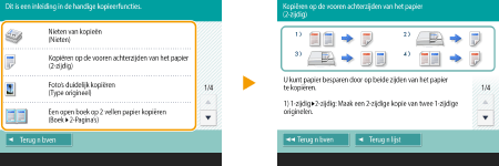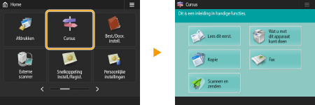 De functiegids bekijkenDruk op <Cursus> om een scherm weer te geven waarop wordt aangegeven wat u kunt doen met de functies van de machine en waarop tips staan voor het kopiëren, scannen, enz. Bekijk dit scherm wanneer u meer informatie wilt over welke functies beschikbaar zijn en hoe u ze moet gebruiken.