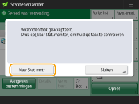 Wanneer <Toon melding als taak is geaccepteerd> is ingesteld op <Aan>, kan het scherm <Statusmonitor> worden weergegeven vanaf het volgende scherm dat wordt weergegeven nadat een verzendopdracht wordt ontvangen. <Toon melding als taak is geaccepteerd>