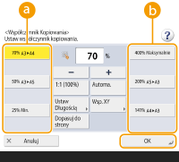 Jeżeli wyświetlany jest ekran wyboru rozmiaru oryginałuJeżeli dla opcji <Wybierz Papier> ustawiono <Aut.>, może zostać wyświetlony ekran wyboru rozmiaru oryginału. Jest on wyświetlany, ponieważ rozmiar oryginału nie może zostać zweryfikowany i papieru nie można wybrać automatycznie w przypadku, gdy chcesz skanować oryginały niezwykle przezroczyste, oryginały, dla których zastosowano niezwykle ciemne kolory podstawowe lub też oryginały o niewielkim formacie. Wybierz rozmiar oryginału lub też rozmiar najbliższy oryginałowi.