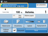 Wyświetla status ustawień, takich jak proporcja kopiowania, format papieru i liczba kopii. Upewnij się, że potwierdzono ustawienia, aby rozpocząć prawidłowy proces kopiowania. Aby zmienić ustawienia, należy nacisnąć na przycisk znajdujący się pod wyświetlaną sekcją.