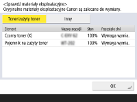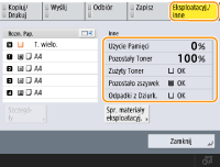 Pozostałą ilość materiałów eksploatacyjnych można sprawdzić z poziomu interfejsu Remote UI (Zdalny interfejs użytkownika). Sprawdzanie statusu urządzenia