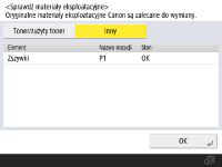 Nawet gdy w pozycji <Pozostało dni> wyświetlany jest status <Wymaga wymia.>, nie należy dokonywać wymiany, dopóki w obszarze wyświetlania statusu (na dole wyświetlacza panelu dotykowego) nie pojawi się komunikat mówiący o konieczności wymiany danego materiału eksploatacyjnego.