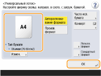 При изменении типа и формата бумагиВ случае загрузки в аппарат бумаги другого типа не забудьте изменить соответствующие параметры. В противном случае аппарат не будет печатать надлежащим образом. Определение размера и типа бумаги в лотке