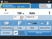 Visar inställningsstatus för exempelvis reproförhållande, pappersformat och antal kopior. Kom ihåg att bekräfta inställningarna för att kunna kopiera. För att ändra inställningarna, tryck på knappen under skärmbildsdelen.
