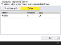 Även om <Kräver byte> visas i <Återstående dagar>, behöver du inte byta förrän ett meddelande om att du ska byta förbrukningsartiklar visas i statusvisningsområdet (längst ned på pekskärmen).