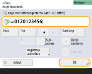 För att skicka fax utomlandsAnge det utländska åtkomstnumret, landskoden och faxnumret, i angiven ordning. Om det inte går att ansluta till mottagaren utomlands, tryck på <Paus> för att infoga en paus mellan ett nummer nästa nummer.