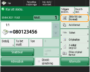 Fax/I-Fax sändjobb: <Prioritera kvalitet> (<Prio. hastighet/bildkvalitet för svartvit scanning>)Om flera telefonlinjer ställs inDu kan välja vilken telefonlinje som ska användas för att skicka fax genom att trycka på <Alternativ>