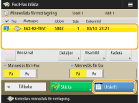 Om du trycker på <Radera> kan du radera ett dokument som delats upp och skickats. Om du väljer <Skriv ut vid radering> kan du ställa in så att det mottagna dokumentet med uppdelade data skrivs ut när det raderas.