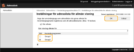 [Personal Address List/User Group Address List Settings], och markera kryssrutan [Apply User Group Name Change to User Group Address List Name]. [Apply User Group Name Change to User Group Address List Name] är bara tillgängligt när personlig autentisering är aktiverad.