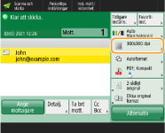 För att välja en mottagare från skärmen <Snabbval> efter scanning anger du <Snabbval> för <Standardskärm>. Arbetet som krävs för sändning av scannade dokument till samma mottagare kan minskas. <Standardskärm>