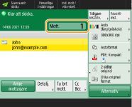 När <Visa meddelande när ett jobb accepteras> är inställt på <På>, kan skärmen <Statusmonitor> visas från följande skärm som visas när ett sändjobb har tagits emot. <Visa meddelande när ett jobb accepteras>
