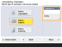 Om formatet som visas i <Originalformat> skiljer sig från formatet på boken, tryck på <Ändra> för att välja format. Endast de originalformat som visas på pekskärmen kan scannas.