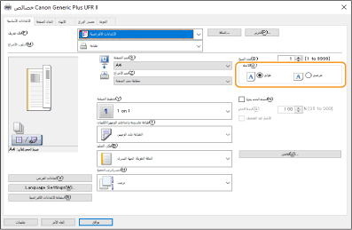 حدد اتجاه المستند الأصلي من شاشة إعدادات الطباعة للتطبيق.