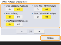 Ακόμα κι αν ο τόνος εισερχομένων έχει οριστεί σε <Off>, ο τόνος εισερχομένων θα εκπέμπεται κατά τη λήψη φαξ σε κατάσταση αναστολής, εάν η κατανάλωση ρεύματος σε κατάσταση αναστολής έχει οριστεί σε χαμηλή. <Χρήση Ενέργειας σε Κατάσταση Αναστολής>