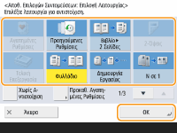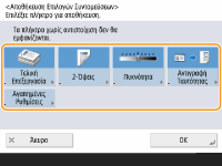 Καταχώριση στις ρυθμίσεις <Αγαπημένες Ρυθμίσεις>Στις ρυθμίσεις <Αγαπημένες Ρυθμίσεις>, μπορείτε να καταχωρίσετε τις συχνά χρησιμοποιούμενες διαδικασίες για τη λειτουργία αντιγραφής, καθώς και τους συχνά καθοριζόμενους προορισμούς και τις ρυθμίσεις για τη λειτουργία σάρωσης. Για περισσότερες πληροφορίες, ανατρέξτε στην ενότητα Αποθήκευση συνδυασμού των συχνά χρησιμοποιούμενων λειτουργιών.