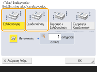 Κατά την αντιγραφή δύο ή περισσοτέρων αντιγράφων από τον τροφοδότη, μπορείτε να επιλέξετε συρραφή ή ομαδοποίηση των εκτυπώσεων. Επιλέξτε «Σελιδοποίηση» για εκτύπωση κατά τη διαδοχική σειρά των σελίδων. Επιλέξτε «Ομαδοποίηση» για εκτύπωση δεσμίδων κάθε σελίδας, π.χ. 10 φύλλα για την πρώτη σελίδα, 10 φύλλα για τη δεύτερη σελίδα και ούτω καθεξής.