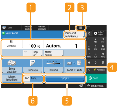 Tiek parādīts iestatījumu statuss, tostarp kopēšanas koeficients, papīra formāts un kopiju skaits. Pārbaudiet iestatījumus, lai kopēšana tiktu veikta pienācīgi. Lai mainītu iestatījumus, nospiediet pogu zem ekrāna daļas.
