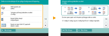 Vis funksjonsveiledningenTrykk på <Opplæring> for å vise et skjermbilde som introduserer deg til hva du kan gjøre med funksjonene på maskinen samt tips for å bruke kopiering, skanning osv. Vis dette skjermbildet når du vil finne ut mer om hvilke funksjoner som er tilgjengelig, og hvordan du bruker dem.