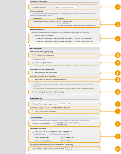 Hvis du vil deaktivere den integrerte godkjenningsfunksjonen kun for påloggede brukere som er registrerte på den lokale enheten, krysser du av i boksen for [Deaktiver integrert autentisering ved bruk av legitimasjon for autentisering for lokal enhet].