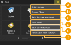 În funcţie de setarea pentru <Permite personalizare ecran Acasă pt. Folosire Uzuală> şi de privilegiile utilizatorului conectat, este posibil să se afişeze un ecran pentru a selecta fie <Personaliz. pt. Fol. personală>, fie <Personal. pt. Folosire Uzuală> atunci când se selectează <Mutare butoane>, <Butoane Editare>, <Setări dispunere ecran Acasă> sau <Setări fundal>.