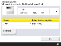 Dacă opţiunea <Selectare auto sursă hârtie> este setată la <Oprit> pentru o anumită sursă de hârtie, nu puteţi să faceţi copii pe hârtia încărcată în acea sursă de hârtie atunci când opţiunea <Selectare hârtie> este setată la <Auto>. <Selectare auto sursă hârtie>