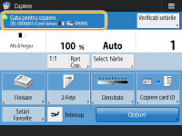 Afişează stările setărilor, precum raportul de copiere, dimensiunea hârtiei şi numărul de copii. Aveţi grijă să confirmaţi setările pentru a copia în mod corespunzător. Pentru a modifica setările, apăsaţi butonul de sub secţiunea de afişare.