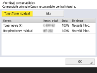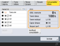 Chiar dacă opţiunea <Necesită Înloc.> este afişată în <Zile rămase>, nu efectuaţi înlocuirea până când un mesaj care vă solicită să înlocuiţi consumabilele nu este afişat în zona afişării de stare (în partea de jos a afişajului panoului tactil).