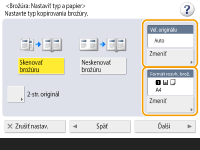 Stlačte tlačidlo <Zmeniť> v časti <Veľ. originálu> a vyberte formát originálu. Ak vyberiete možnosť <Auto>, formát brožúry sa vyberie automaticky podľa formátu originálu.