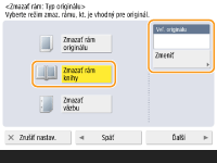 Pri skenovaní originálov, ktoré sú menšie ako formát skenovania, sa v naskenovanom obraze môžu zobraziť čiary orámovania originálu. Pri skenovaní hrubej knihy sa môžu zobraziť tmavé okraje. Táto funkcia umožňuje vymazať tieto čiary orámovania a tmavé okraje. Zariadenie môžete tiež nastaviť tak, aby nekopírovalo otvory po dierovaní v origináloch.