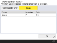Tudi če je v <Preostali dnevi> prikazano <Potrebna zam.>, ne opravite zamenjave, dokler se na območju prikaza stanja (na dnu zaslona na dotik) ne prikaže sporočilo, ki vas poziva k zamenjavi potrošnega materiala.
