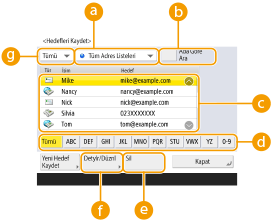Adres listesinde görüntülenecek hedefleri filtrelemek için <Kişisel Adr. Listesi>, <Adres Listesi 1> ila <Adres Listesi 10> veya <Yön. Adres Listesi> seçeneğini belirleyin.