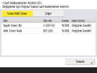 <Kalan Günler> içeriğinde <Değştrm Gerekli> görüntülense bile durum görüntüleme alanında (dokunmatik panel ekranının altında) sarf malzemelerini değiştirmenizi isteyen bir mesaj görüntülenene dek değiştirme işlemini gerçekleştirmeyin.