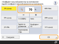 Копії можна збільшити або зменшити, вказавши коефіцієнт масштабування під час копіювання (%). Співвідношення по вертикалі та горизонталі можна вказувати окремо.