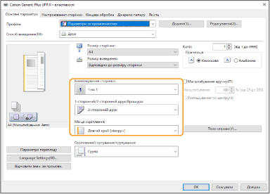 [Порядок розташування сторінок] [1-сторонній/2-сторонній друк/брошура] [Місце скріплення].