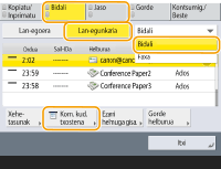 (Egoera-monit.) sakatzean, egoeraren monitorea pantaila bistaratuko da, eta funtzio bakoitzeko erabilera-historia egiaztatu ahal izango duzu, hala nola kopiatzea, inprimatzea, mezu elektronikoak bidaltzea, faxak/I-faxak bidaltzea/jasotzea, etab. Pantaila horretan ere funtzio bakoitzeko erabilera-historia inprima dezakezu.