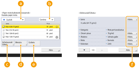 Paper-mota pertsonalizatuaren ezarpenak erregistratzean, aldatu iezaiozu izena. Makinan erregistratutako paper-mota lehenetsien ezarpenak ezin dituzu aldatu.