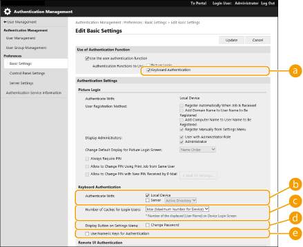 If this function is enabled and the user name and password are comprised of numbers only, authentication can be performed with numeric key entry only.