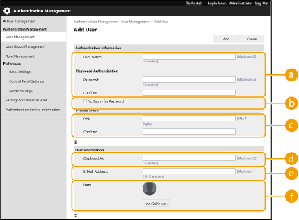 [No Expiry for Password]Select the check box to set the password of the user to register to have no expiration date. This setting can be specified when [Password Validity Period] is set to [Off] in [Password Settings Policy] in [Authentication] in [Security Policy Settings].