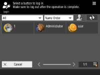 | | This method enables users to log in by pressing a user name displayed on the control panel, eliminating the task of entering a user name. This method is only available to users who are registered to the local device. To prevent unauthorized logins, it is also possible to set a PIN. User information can be registered manually or automatically ( Configuring the User Login Methods and Authentication Devices). |