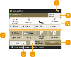 When you press <Scan and Store> on the <Home> screen, and then press <Network> or <Memory Media> to scan originals, the following setting screen is displayed.