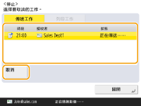 (停止),目前的傳送/列印工作會暫停且顯示 <傳送工作>/<列印工作>。