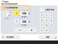 顯示數字鍵圖示時< 您可以使用數字鍵。> 顯示時,您可以使用觸控面板顯示幕上右邊的數字鍵輸入數值。範例:<XY倍率> 設定畫面 ![]() < 使用數字鍵輸入。> 顯示時,只能使用觸控面板顯示幕上右邊的數字鍵輸入數字。從 USB 鍵盤輸入字元若要輸入字元,您也可以將 USB 鍵盤連接到 USB 連接埠 (正面) 來使用。從 USB 鍵盤輸入時,請注意下列各點。 將 <USB設定> 中的 <對USB輸入裝置使用AddOn驅動程式> 設定為 <關閉>。<對USB輸入裝置使用AddOn驅動程式> 只能從 USB 鍵盤輸入 ASCII 字元。 無法在 USB 鍵盤上使用觸控面板顯示幕的鍵盤畫面未顯示的按鍵,例如 Delete、End、Tab、Esc 和功能鍵。 按照音效設定畫面的 <輸入提示音> 和 <無效輸入提示音> 設定,將發出 USB 鍵盤的輸入音效。設定聲音 |