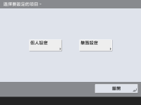 可個人化項目的清單)。如果您選擇 <裝置設定>,則設定會註冊為本機的設定。如果您以沒有管理員權限的使用者身分登入,就如同選擇 <個人設定> 時一樣,這時如果變更可個人化的項目,則設定會註冊為個人設定,而不會註冊為裝置設定。